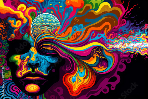 Digital artwork of woman with colorful eyes emitting rainbow. Impressionist art illustration.