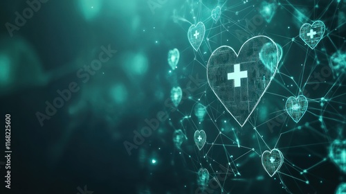 Digital background featuring a heart icon, a visualization of the concept of interconnected health technology aspects of the world of health are interrelated