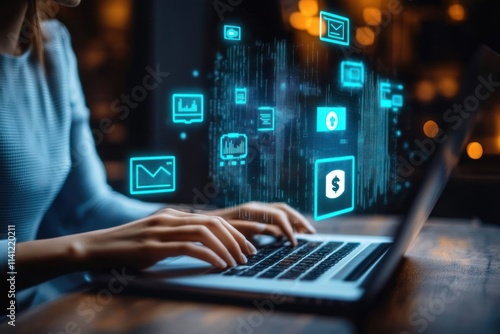 Digital Banking Workspace with Holographic Financial Icons and Laptop User in Cyberpunk Style