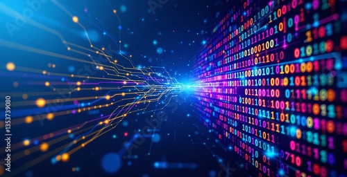 Digital binary code and data flow connections in a futuristic tech background. Bright neon colors and glowing circuit lines represent digital communication. Ai generative
