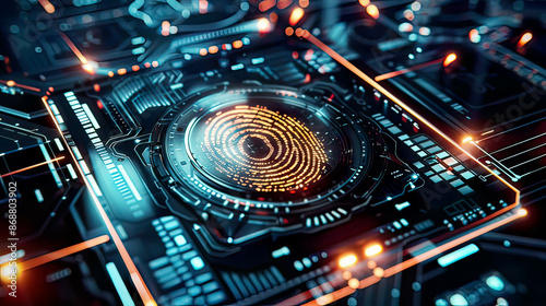 Digital biometric identification by fingerprint, advanced scanning system, intricate holographic interface, detailed patterns, photorealistic 3D rendering, sleek modern design,