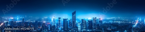 digital blue gradient background with futuristic cityscape, glowing lights and skyscrapers, panoramic view, panoramic view