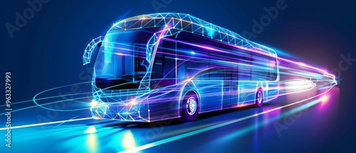 Digital blue high-speed bus in low poly wireframe, the future of logistics and public Transportation management. Smart Cities and Connected Transport Networks , Autonomous and Self-Driving.