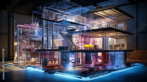Digital blueprint of a modern office building featuring holographic elements and design innovation