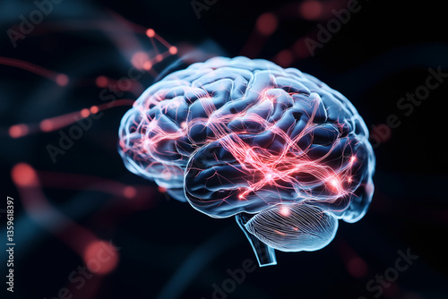 Digital Brain Illustration: Neural Network and Connectivity concept, illuminated against a dark backdrop