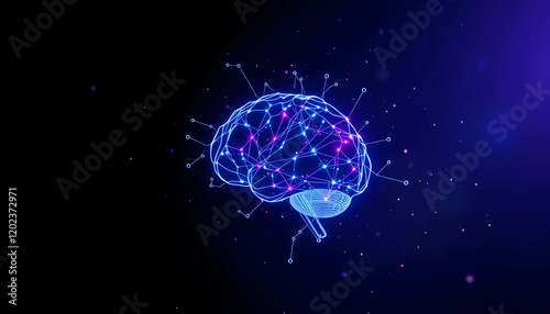 Digital brain with interconnected nodes and glowing particles, representing neural networks and intelligence. Dark purple background