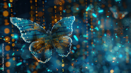 digital butterfly composed of binary code, symbolizing transformation and technology. vibrant colors and glowing particles create captivating visual effect