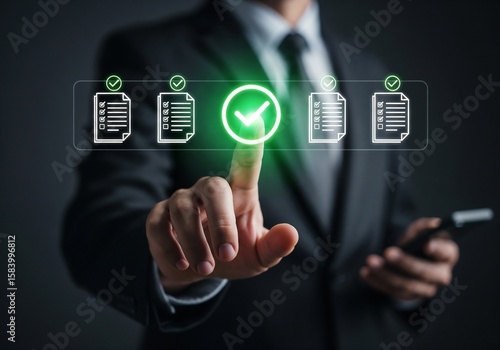Digital checklist and approval workflow showing business document validation and task tracking system for decision making, process optimization, and quality verification with high efficiency