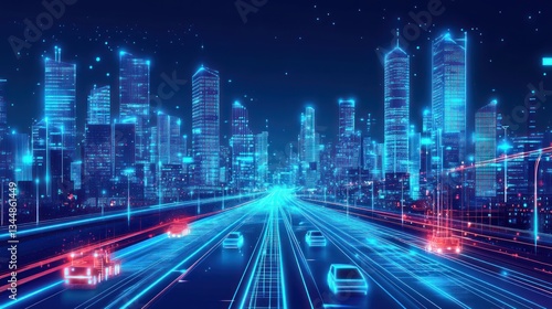 Digital city highway, futuristic cityscape, glowing vehicles, night travel