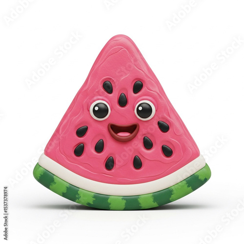 Digital clay watermelon slice with happy face and seeds, 3D effect