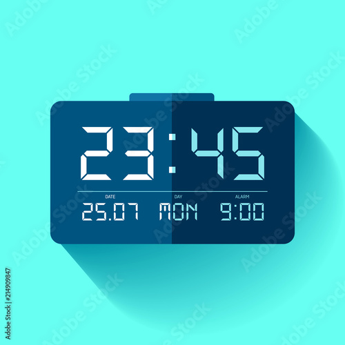 Digital Clock icon in flat style, timer on blue background. 23:45. Simple watch. Vector design element for you business projects