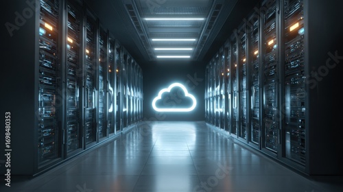 Digital cloud computing illustration in server room.