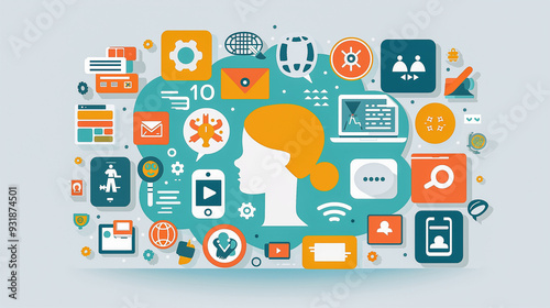Digital communication and technology icons surrounding a human profile..