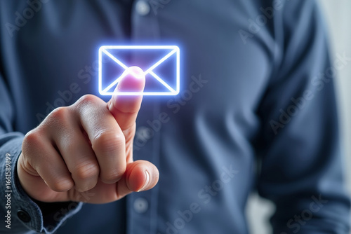 Digital Communication Concept Man Touching Glowing Email Icon on Screen with Low Feedback, Modern Technology Interface for Messaging and Connectivity