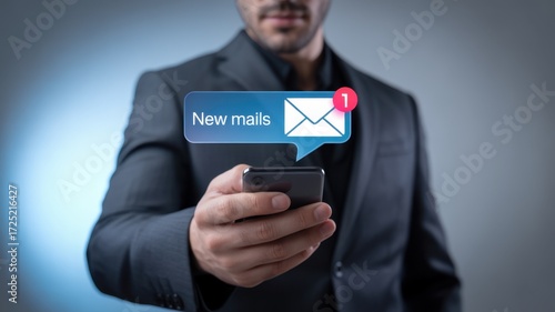 Digital Communication in Focus: A man, elegantly dressed in a suit, focuses on his smartphone, which displays a notification of new emails, capturing the essence of modern digital communication.