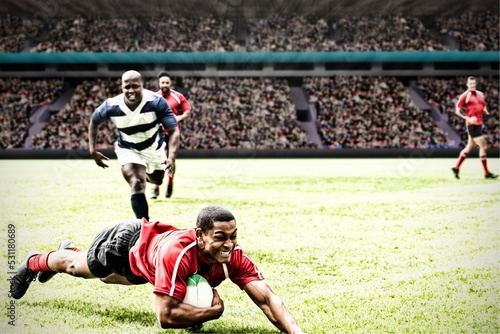 Digital composite image of rugby player jumping with the ball to score touchdown in sports stadium