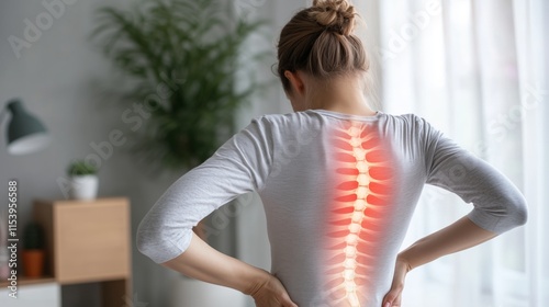 Digital composite of highlighted spine of woman with back pain