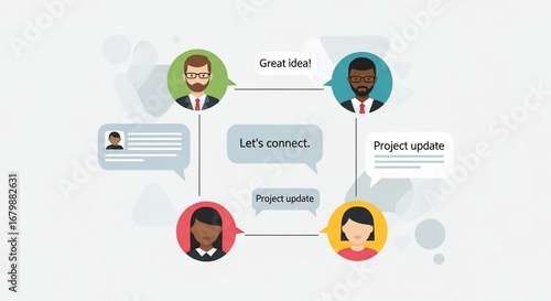 Digital Connection: A visual representation of teamwork and brainstorming, with diverse individuals in a digital dialogue, connected by ideas.