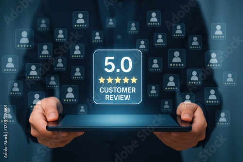Digital Customer Review Concept with Five Star Rating and User Feedback on a Tablet in a Business Setting