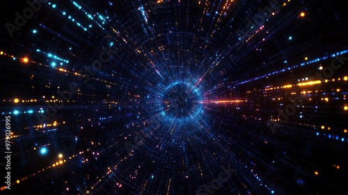 Digital data tunnel, with a blue and orange light effect background in a high-tech style, featuring futuristic design elements