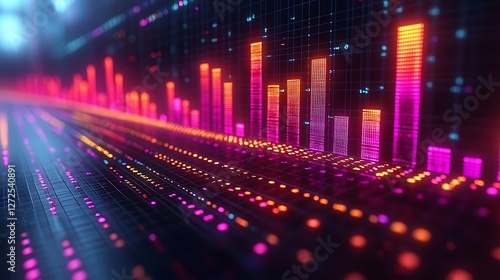 Digital data visualization glowing bar chart, financial growth, technology background, stock market analysis