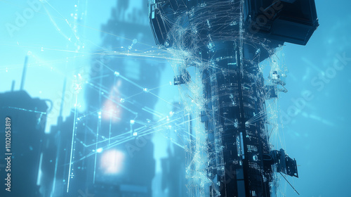 Digital data visualization tower futuristic city graphic design urban landscape aerial view technology concept