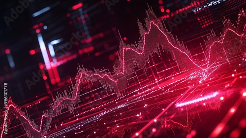 Digital data visualization with red graph elements on a dark background, symbolizing analytics and technology trends.