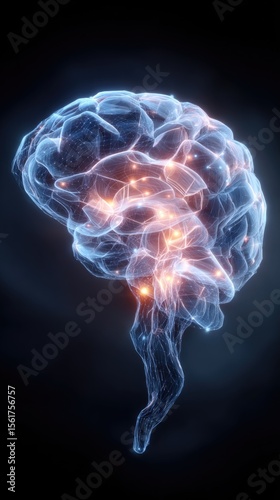 Digital depiction of a human brain with glowing nodes, showcasing neurological activity and connectivity against a dark backdrop, creating a futuristic aesthetic.
