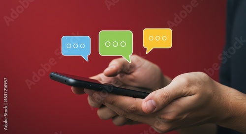 Digital Dialogue: Close-up of a person's hands using a smartphone, with vibrant speech bubble icons indicating online communication. The focus is on the ease and accessibility of digital interaction.