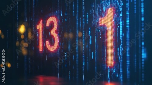 Digital display of numbers 13 and 1. Abstract glowing numbers against a backdrop of binary code