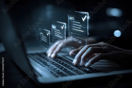 Digital document management on laptop with online approvals and electronic signature concepts, showcasing workflow efficiency
