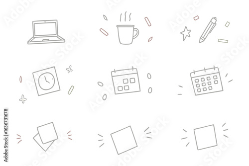 Digital Doodle: A collection of simple doodle line art elements illustrating laptop, coffee cup, star, pencil, watch, calendar, sheets of paper, ideal for web design and graphic design.