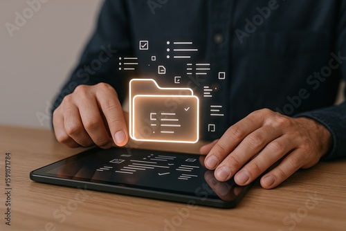 Digital File Folder Icon Hovering Over Tablet Screen With Data Transfer Symbols.