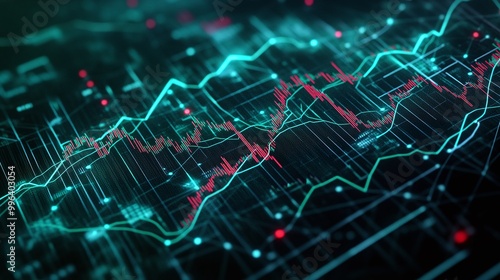 Digital financial chart with glowing lines and data points on a dark background.