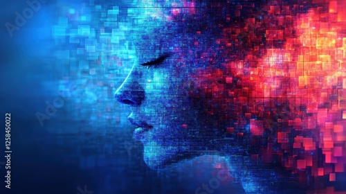 Digital fusion: profile of a woman in abstract pixel art with vibrant blue and red hues