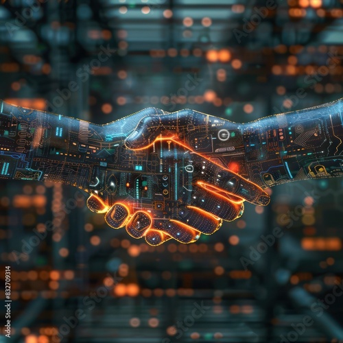 Digital futuristic handshake symbolizing artificial intelligence and technology agreements in an advanced digital world.