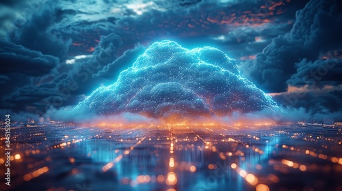 Digital Futuristic Holographic Cloud Storage System with Blue Neon Lights Illuminating High Detail Technology Concept Art