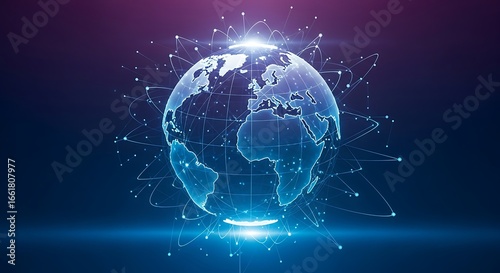 Digital global network connecting the world with bright lights and particles