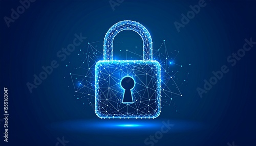 Digital glowing padlock made of connected network lines on dark blue background symbolizing cybersecurity and data protection.