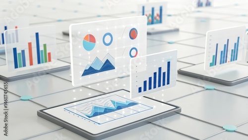 Digital graphs and charts floating above tablets, representing data analysis and business analytics in a modern, tech-driven environment.