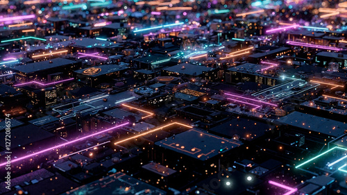 Digital grid with glitch effect and vibrant lighting, creative innovation