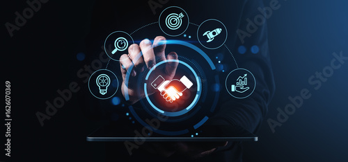 Digital handshake and business strategy concept with icons for innovation, target, analytics, growth, and teamwork on dark tech background.