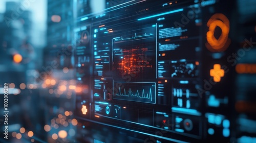 Digital healthcare technology featuring electronic medical records displayed on a futuristic, glowing screen.
