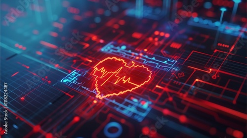 Digital Heartbeat: A glowing red heart formed from a digital EKG beats rhythmically on a complex circuit board, symbolizing the intersection of technology and healthcare.