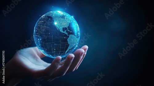 Digital hologram of the Earth globe floating above a person's hand with network lines and glowing technology concept for global connectivity and innovation