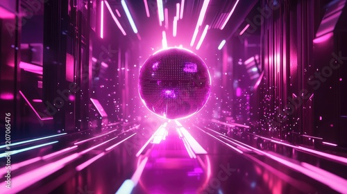 Digital holographic AI sphere glowing in vibrant patterns, surrounded by particle effects and futuristic light trails