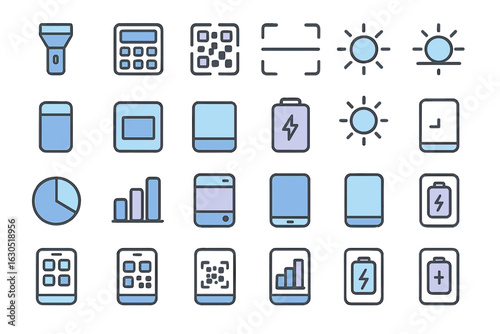 Digital icons representing various smartphone functions and features designed in a minimalistic style