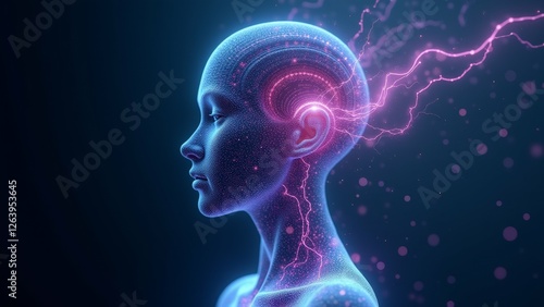 digital illustration human head neck head profile side facing towards right side background dark blue small pink dots scattered throughout center head pink lightning bolt striking down top right