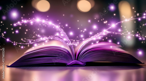 Digital Illustration Of A Glowing Purple Magic Book With Sparkling