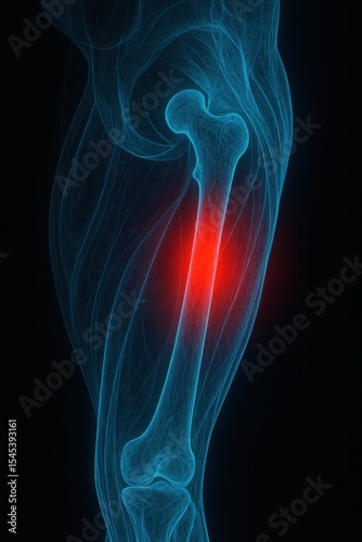 Digital illustration of a human bone with highlighted pain area in red against a black background.
